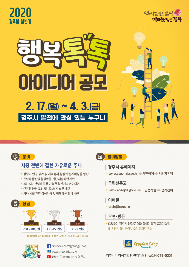 경주시는 창의적 아이디어를 적극적으로 발굴해 시정에 반영함으로써 소통과 시민참여행정을 실현하기 위해 ‘2020년 경주시 상반기 행복톡톡 아이디어 공모’를 개최한다.