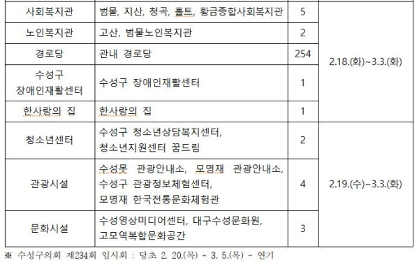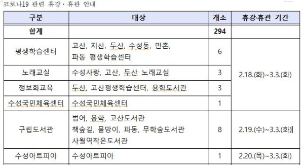 수성아트피아, 고모역 복합문화공간 등은 20일부터 임시휴관에 들어간다.