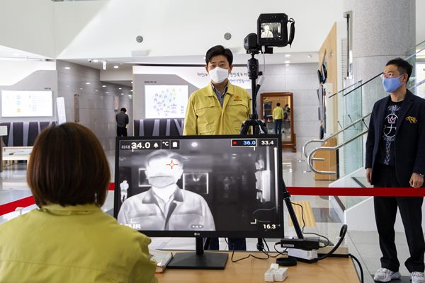 또한 실질적인 모니터링이 될 수 있도록 직원과 청경, 안내원 등 가용자원을 모두 동원해 근무조로 편성해서, 청사에 출입하는 직원과 모든 인원은 매일 열화상카메라를 통해 발열 등 이상 유무를 확인하고 있다.