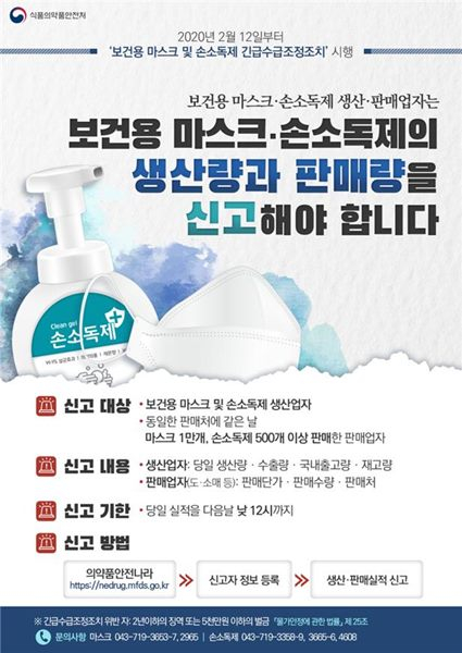 이번 조치 이전에도 식약처는 대구·경북지역 코로나 19 예방지원을 위해 의료기관·약국·마트에 보건용 마스크 35만개를 우선 공급한 바 있으며, 대구지방식약청에 특별대책지원본부도 운영 중입니다.