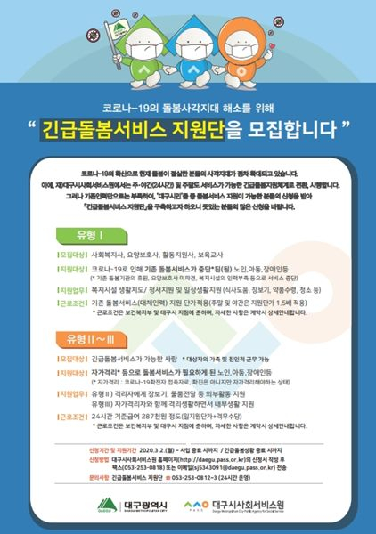 대구시사회서비스원은 우선 사회복지사, 요양보호사, 보육교사 등 자체 인력 중심으로 긴급돌봄서비스를 추진하고, 부족한 인력은 「긴급돌봄서비스지원단」모집공고를 통해 대구시민 중 뜻있는 사람들의 지원을 받아 확보할 예정이다.
