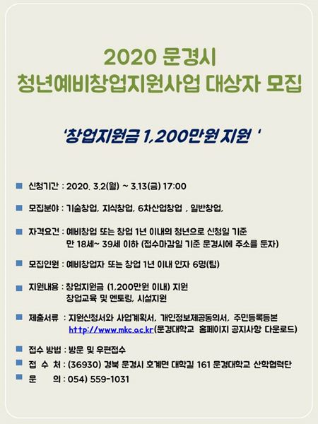 문경시는 2020년 청년예비창업지원사업에 참여할 예비 청년사업자를 모집한다.