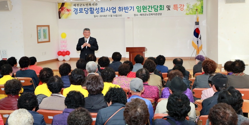 김학동 예천군수는 지난 14일 예천군 노인복지 회관에서 경로당 활성화 사업 임원과 회원 100여 명을 대상으로 ‘경북의 중심! 도약하는 예천'이란 주제로 특강을 했다.