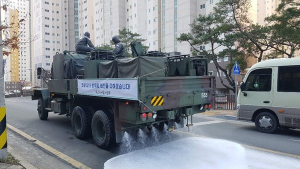 영천시(시장 최기문)는 코로나19 대응을 위해 군부대 제독차량을 지원 요청해 3일부터 영천내 중점관리 아파트 주요도로에 긴급방역을 실시한다.