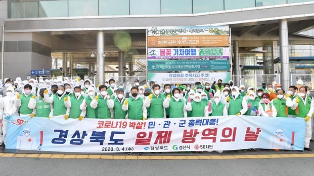 경북도는 코로나19에 총력 대응하기 위하여 3월부터 매주 이틀(수요일, 일요일)을 ‘경상북도 일제 방역의 날’로 지정하여 보다 집중적이고 효과적인 방역활동을 추진하고자 민·관·군 합동으로 일제방역을 실시한다. 경상북도 일제 방역의 날에는 도내 23개 시․군 새마을회, 시·군 공동방제단(가축방역부서, 축협)과 군부대 장병들이 일시에 인력 및 장비를 총동원하여 방역 활동에 나서는 것이다.
