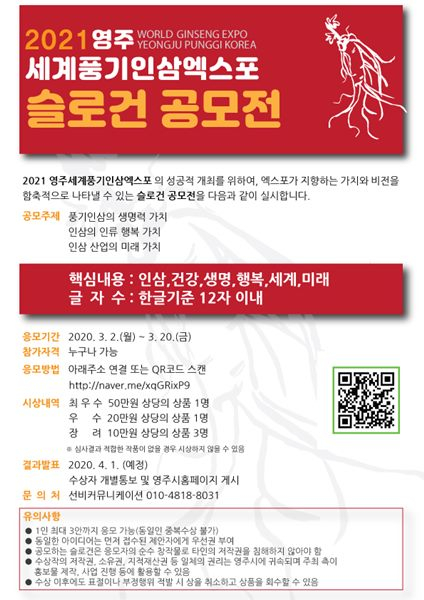 시 관계자는 “슬로건 공모전은 국민적 관심과 아이디어를 담아 함께하는 풍기인삼엑스포로 추진하기 위해 실시하는 이벤트이므로 많은 사람들이 참여해 주기를 바란다.”고 말했다.
