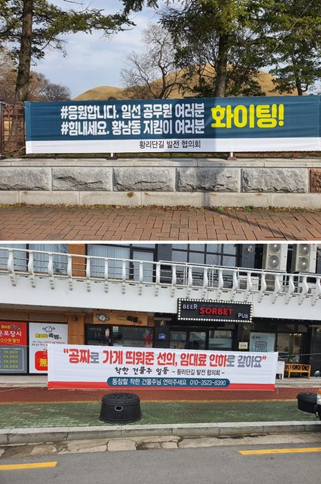 황리단길 발전협의회(회장 김해수)는 ‘착한 임대료 운동에 동참해 코로나19 사태를 이겨내자’라는 현수막 10여개를 황리단길 곳곳에 내걸고 착한 임대료 운동에 앞장서달라고 호소하고 있으며, 황남시장 상점을 시작으로 자발적으로 점포 임대료를 깎아주겠다고 나서는 건물주들이 늘어나고 있다.