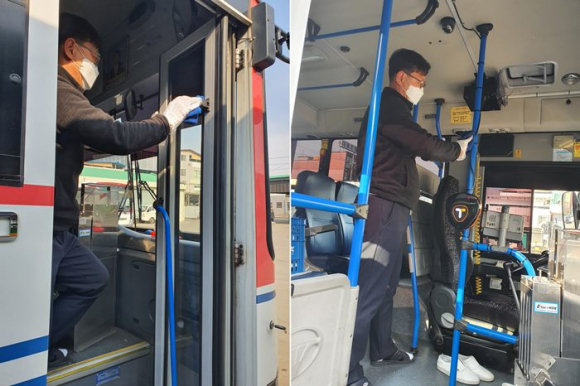 시는 코로나19 확산을 차단하기 위해 시내버스 운행 전후 승객 손이 많이 닿는 차량 내 기둥과 의자 손잡이·등받이·요금함 등 버스 내부 및 터미널 등 운송시설을 매일 소독하고 있다.