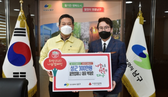 대구광역시 남구청(구청장 조재구)에서는 지난 3월 5일, 꿈벗컴퍼니(대표 박대호)에서 코로나19 확산에 따른 지역의 위기 극복을 위해 성금 300만 원을 기탁하는 등 기부가 이어지고 있다.