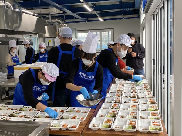청년봉사단은 코로나19로 꽁꽁 얼어붙은 경산지역 경제 살리기의 일환으로 손님이 급감한 경산의 전통시장과 음식점의 식자재를 직접 구입해 도시락을 만들었다.