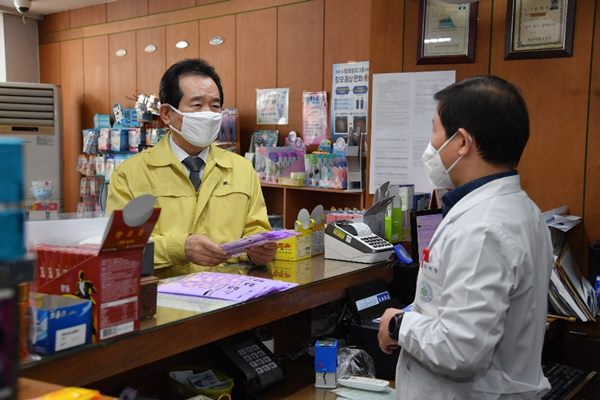 정세균 국무총리는 3월 9일(월) 오전, 공적 마스크를 판매하고 있는 대구 ‘명문약국’(대구 중구 국채보상로 524)을 방문했습니다.
