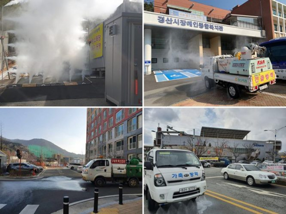 경산시에서는 매주 월요일과 금요일을 일제방역의 날로 정하여 가용 가능한 가축방역차량 5대 중 시 보유 방역차량 2대는 시민의 이용이 많은 경산역, 하양역, 지하철역(정평, 임당, 영대역), 시외버스터미널, 재래시장 등을 일제소독을 실시하고 있으며, 경산축협의 공동방제단 차량 3대는 경산산업단지 및 쓰레기 매립장등 민원발생지역을 집중소독하고 있으며, 대학교 주변 다가구주택, “코로나 19”발생지역등에 꼼꼼하게 소독을 실시하여 코로나19의 차단방역에 최선을 다하고 있다.