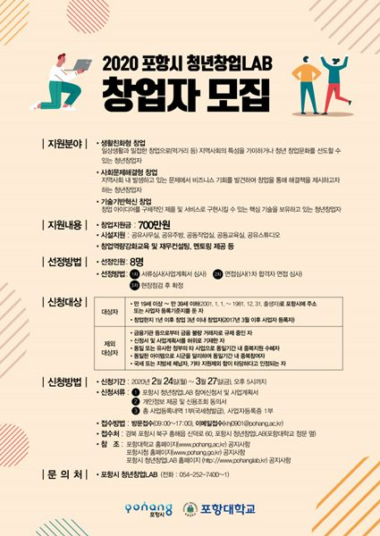 포항시는 ‘2020년 포항시 청년창업LAB‘의 청년창업자를 모집한다.