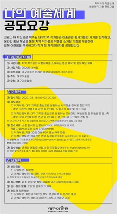대구미술관은 코로나19 사태로 어려움을 겪는 지역 미술인을 위해 온라인 홍보영상 제작지원 프로그램인 ‘나의 예술세계’를 공모하고 이달 16일부터 20일까지 참가 신청을 받는다.