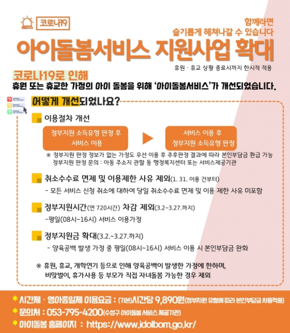 수성구는 아이돌보미에게 마스크를 일괄지급하고 일일 체크리스트 보고 등 근무 매뉴얼을 마련했다. 이는 코로나19로 인한 학교와 어린이집, 유치원의 장기간 휴원·휴교에 따른 아이돌봄서비스 이용증가에 대비하기 위한 조치다.