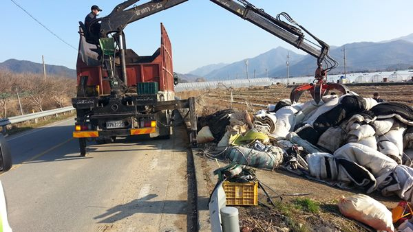 최근 바쁜 방역활동 와중에도 쾌적한 농촌 환경 조성을 위해 5톤 집게차와 면사무소 공용차량을 동원하여 대장리 등 5개 마을에서 폐부직포 및 영농폐기물 약 15톤을 수거 처리했다.