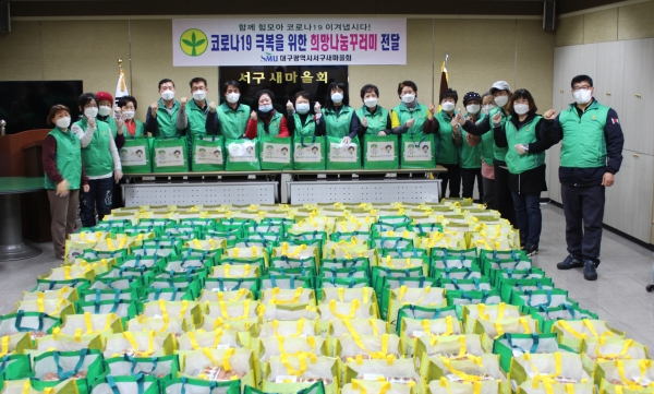 대구 서구새마을회(회장 김동근)는 지난 12일 서구새마을회관에서 코로나19로 생활이 어려운 독거노인을 돕기 위해 ‘희망나눔 꾸러미 지원행사’를 마련했다.