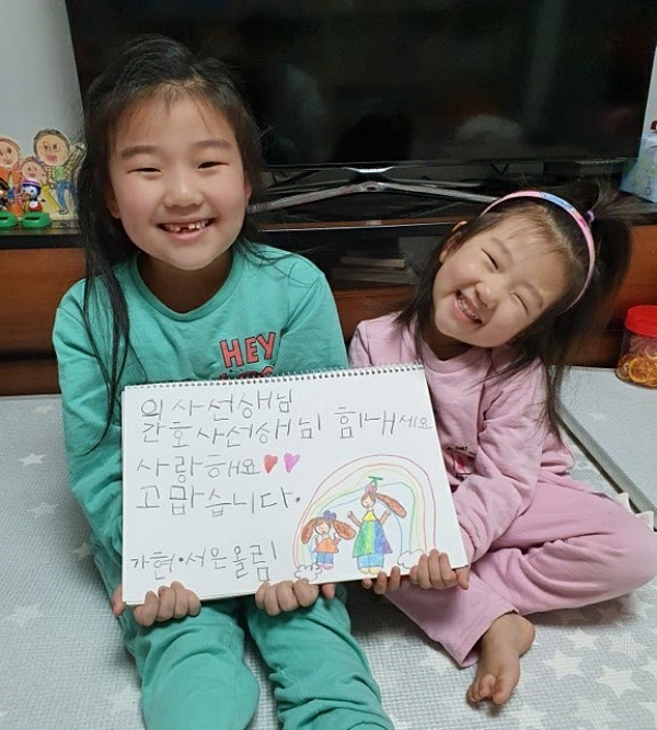 | ↑↑ 아이들이 '의사선생님, 간호사선생님, 힘내세요!'라는 응원 그림편지를 들고 활짝 웃고 있다. |