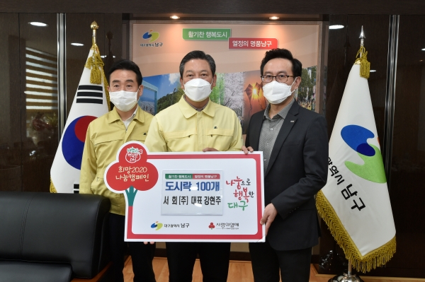 대구광역시 남구청(구청장 조재구)에서는 지난 17일, 서회(주)(대표 강현주)에서 남구청을 찾아 코로나19와 사투를 벌이고 있는 의료진과 현장 관계자들을 위해 도시락 100개를 전달했다고 밝혔다.