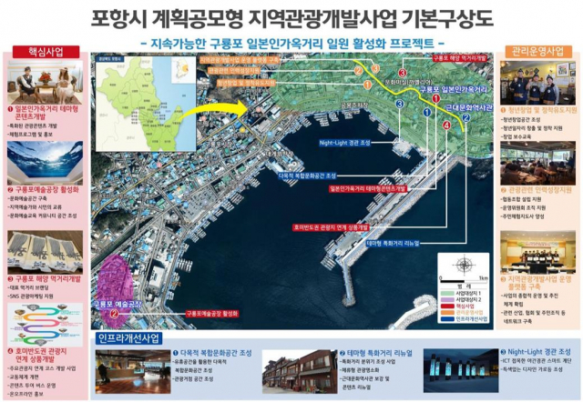 사업의 내용을 살펴보면, 올해부터 2024년까지 5년 동안 200억원을(국비 100억, 지방비 100억) 투입해, 일본인가옥거리 테마형콘텐츠 개발, 구룡포예술공장 활성화, 구룡포 해양먹거리개발, 호미반도권 관광지연계상품개발, 청년창업 및 정착유도 지원 등 다양한 사업을 추진한다.