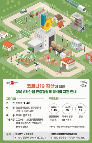 경상북도는 코로나19의 발생이후 판로확보에 어려움을 겪고 있는 경북 6차(농촌융복합)산업 인증 경영체에게 택배비를 지원한다고 밝혔다.