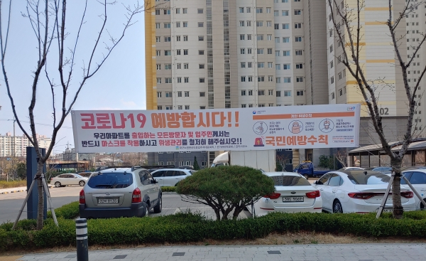이 아파트는 지난 2월 코로나19가 대구지역에 발생하자 예방을 알리는 현수막을 게첨하여 주민들의 위생수칙을 강조했고, 발 빠르게 살균소독제와 손세정제를 구입하여 아파트 내 승강기와 계단 등을 매일 2회 이상 소독하고 승강기 내부에 손세정제를 비치하여 입주민 모두가 코로나19 예방과 확산방지에 앞장서고 있으며, 노원동행정복지센터와도 협력을 강화하여 코로나19 종식을 위해 힘을 쏟고 있다.