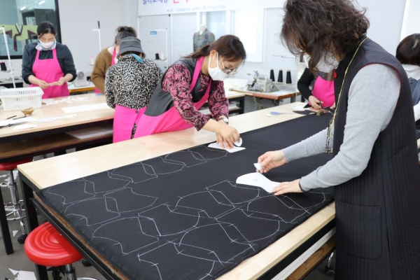 | ↑↑ 수성 글로벌 ESD 실천 연대 회원들이 마스크 도안을 천에 그리고 있다. |