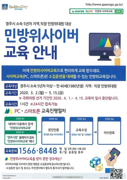 경주시 민방위 사이버교육은 경주시청 홈페이지나 인터넷 포털에서 민방위사이버교육 사이트에 접속한 뒤 본인인증을 거쳐 교육을 받으면 된다.