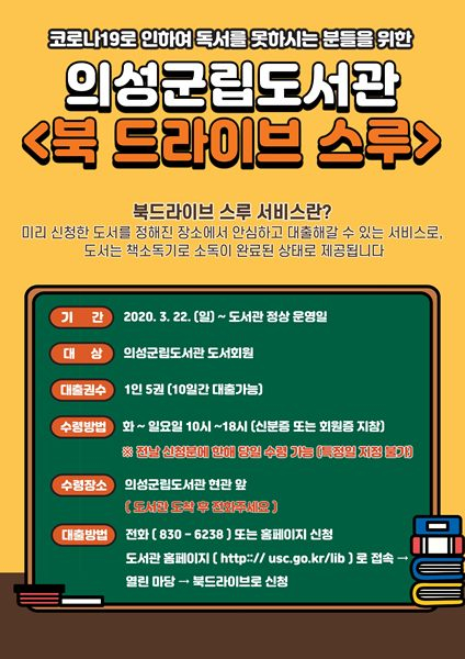 의성군(군수 김주수)은 코로나19 확산으로 도서관 휴관이 장기화됨에 따라 도서대출과 관련된 군민의 불편을 해소하고자 오는 22일부터 북 드라이브-스루(도서대출 배달서비스)를 운영한다고 밝혔다.