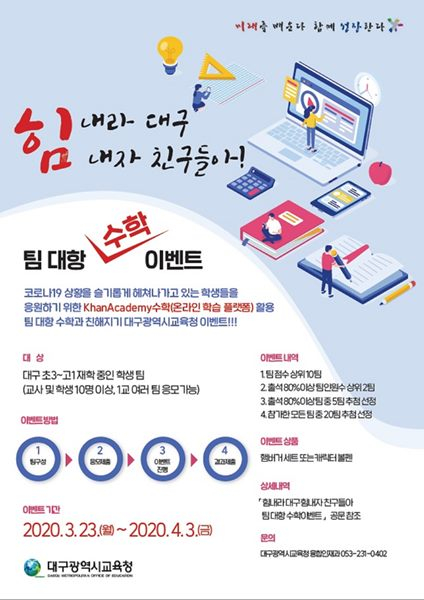 대구시교육청(교육감 강은희)은 오는 3월 23일(월)부터 4월 3일(금)까지 2주간 ‘힘내라 대구, 힘내자 친구들아! 팀 대항 수학이벤트’라는 주제로 온라인 학습플랫폼(Khan Academy수학)을 활용한 ‘팀 대항 수학과 친해지기 이벤트’를 실시한다.