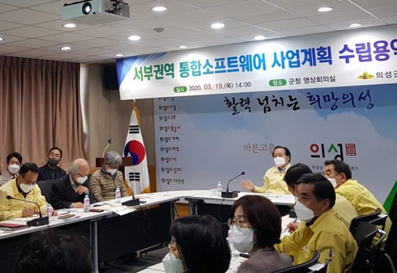 의성군(군수 김주수)은 지난 3월 19일, 군청 영상회의실에서 군수 주재로 관계 공무원과 중간지원조직 센터장 등 총 21명이 참석한 가운데‘서부권역 통합소프트웨어 사업계획 수립’용역 보고회를 개최했다.