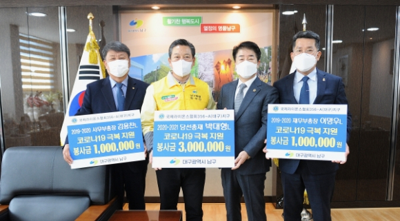 대구광역시 남구청(구청장 조재구)에서는 3월 20일, 코로나19 극복을 위해 국제라이온스협회 356-A(대구)지구 2020-2021 당선총재 박대형L에서 성금 300만 원, 2019-2020 사무부총장 김용찬L에서 성금 100만 원, 2019-2020 재무부총장 이명우L에서 성금 100만 원을 전달하였다고 밝혔다.
