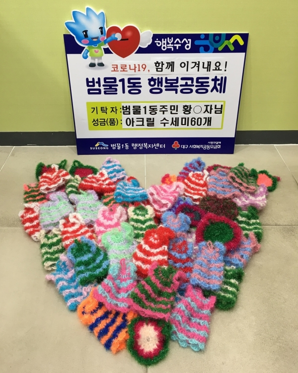 대구 수성구(구청장 김대권)는 지난 18일 범물1동에 거주하는 황○자씨가 범물1동 행정복지센터를 방문해 코로나19로 생활이 어려운 세대를 위해 손수 만든 수세미 60개를 전달했다고 전했다.