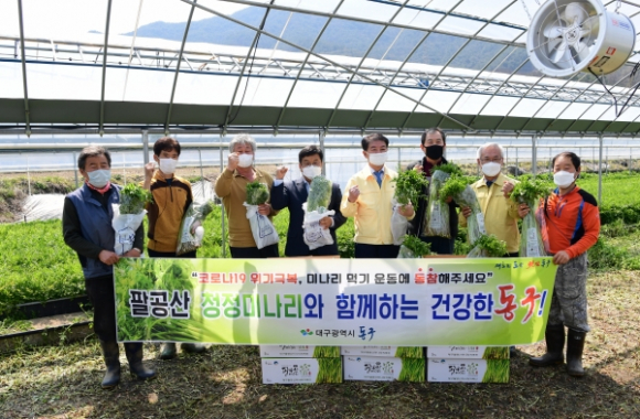 대구광역시 동구청(청장 배기철)은 25일 코로나19로 어려움을 겪고 있는 팔공산 미나리 재배 농가를 방문하여 현장의 목소리를 듣고 판로개발을 위해 힘쓸 것을 약속하며 농가를 격려하였다.