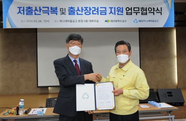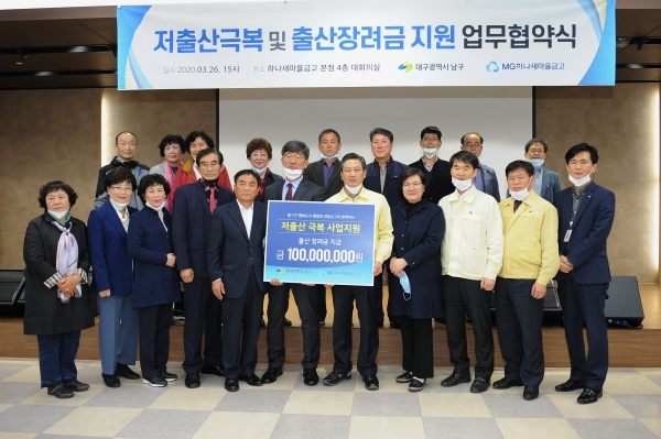 대구광역시 남구청(구청장 조재구)에서는 지난 26일, 지역사회 저출산 문제를 함께 극복하고자 MG하나새마을금고(이사장 박재판)와 ‘저출산 극복 및 출산장려금 지원 업무 협약’을 체결했다.