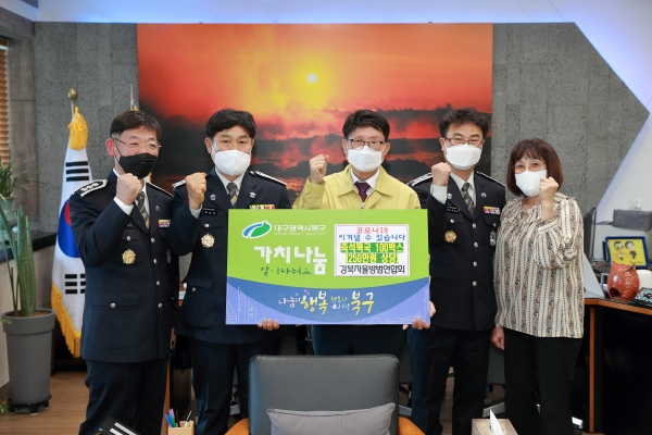 배광식 북구청장은 “따뜻한 마음을 모아 후원물품을 지원해 주셔서 감사드리며 코로나 종식을 위해 최선의 노력을 다하겠다.”고 말했다.