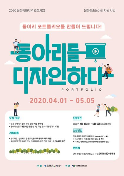(재)안동축제관광재단은 문화특화지역 조성사업의 일환으로 오는 5월 5일까지 문화예술동아리 포트폴리오 제작 지원 사업 ‘동아리를 디자인하다’에 참여할 동아리를 모집한다.