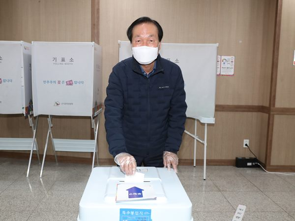 김주수 의성군수가 4월 10일 오후 2시, 금성면문화센터 1층에 위치한 사전투표소를 찾아 한 표를 행사했다.