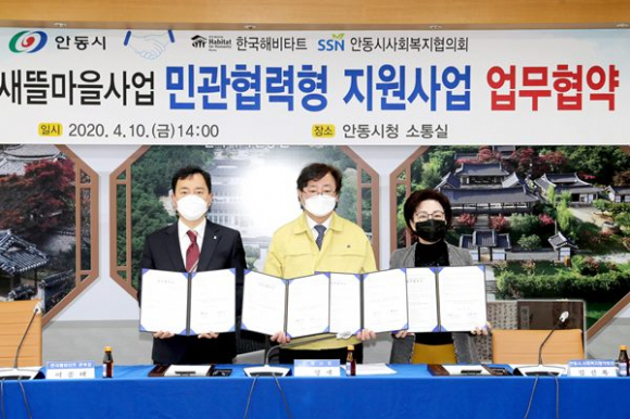 안동시와 한국해비타트, 안동시 사회복지협의회가 4월 10일 오후 2시 안동시청 소통실에서 태화동 새뜰마을사업 구역 내 민·관 협력형 지원사업 추진을 위한 업무협약을 체결했다.