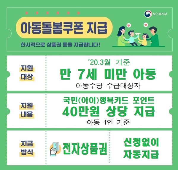 돌봄쿠폰은 아동 보호자 소유의 국민∙아이행복카드로 지급되며, 별도의 신청 없이 13일 일괄 지급된다. 카드 미소유자의 경우, 읍면사무소에서 기프트카드를 신청하면 되며, 카드는 신청 시 작성된 주소지로 배송된다.