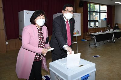 주낙영 경주시장은 4월 15일 오전 선도동행정복지센터 2층에 마련된 선도동 제1투표소를 찾아 제21대 국회의원 선출을 위한 투표를 하고 있다.
