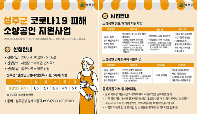코로나19 여파로 지역경기침체 등 소상공인이 어려움을 겪고 있는 가운데 성주군은 코로나19 피해 소상공인 「점포 재개장 지원사업」 및 「경제회복비 지원사업」에 대해 읍면사무소를 통해 4. 20일부터 신청·접수 받는다.
