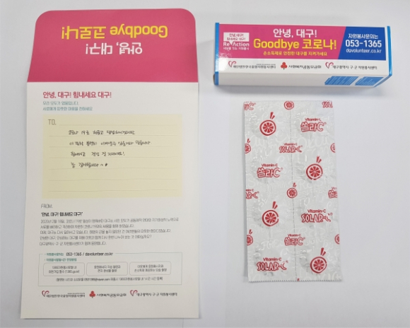 | ↑↑ 희망메시지 봉투와 응원키트(손소독젤, 비타민) 모습 |