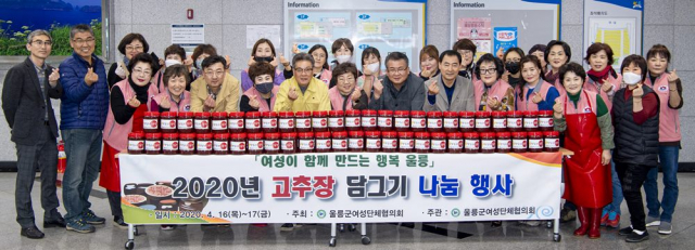 울릉군여성단체협의회(회장 최윤정)는 4월 16일~17일 2일간 울릉한마음회관에서 ‘고추장담그기 나눔 행사’를 실시했다. 행사에는 울릉군여성단체협의회 회원 30여명이 참여했으며, 지역 내 독거어르신들과 어려운 이웃 170가구에 가구당 2kg의 고추장을 전달했다.