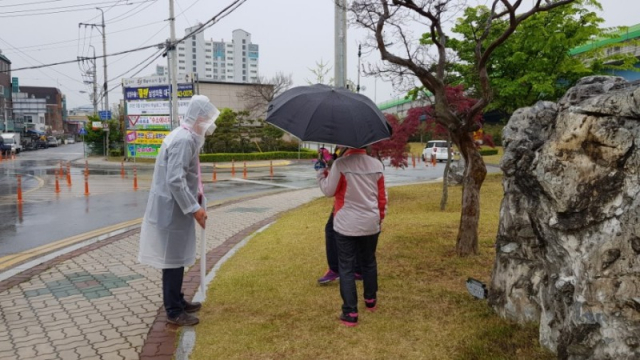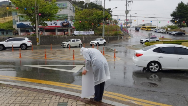 | ↑↑ 4월 17일 칠곡군 왜관읍 교차로에서 우의를 입고 '새로운 미래와 희망을 만들겠습니다'란 피켓을 들고 지역민들에게 당선감사인사를 하고 있는 정희용 국회의원 당선자 |