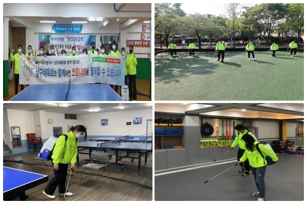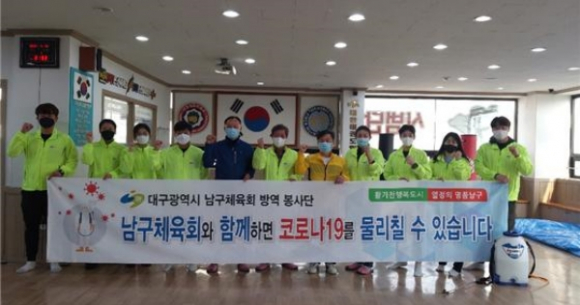대구광역시 남구청(구청장 조재구)은 남구체육회(회장 정호재)에서 코로나19 조기 종식을 위해 생활체육지도자들이 직접 나서 관내 체육시설 30여곳을 대상으로 방역활동에 앞장서고 있다고 20일 밝혔다.