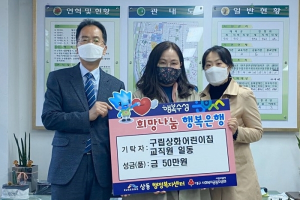 대구 수성구 구립상화어린이집(원장 은순향) 교직원들은 최근 상동 행정복지센터를 방문해 저소득 가정 이웃돕기 성금 50만 원을 기탁했다.