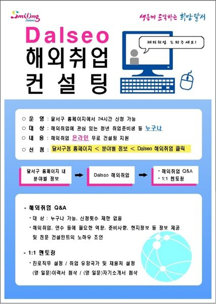 대구 달서구(구청장 이태훈)는 전국 지자체 최초로 홈페이지를 통해 해외취업 희망자들에게 전문 컨설턴트와 일대일 온라인 상담을 지원하는 ‘Dalseo 해외취업 온라인 무료 컨설팅’ 서비스를 운영한다고 밝혔다.