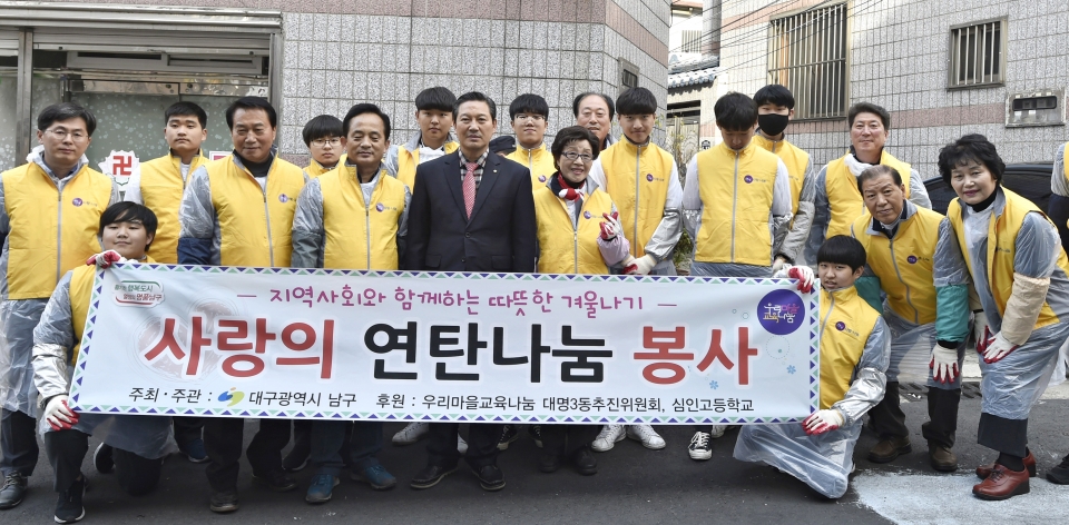 대구 남구청(구청장 조재구)은 지난 19일 대명3동 우리 마을 교육 나눔 사업 추진 위원회(위원장 류해열)와 심인중·고등학교 학생이 사랑의 연탄배달 봉사를 펼쳤다고 밝혔다.