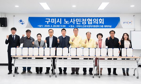 구미시 노사민정협의회(공동의장 구미시장 장세용, 한국노총 구미지부 의장 김동의)는 지난 4월 28일(화) 코로나19로 인한 지역경제 위기극복과 고용안정을 위한 「구미시 노·사·민·정 상호협력 공동선언문」 을 구미시 근로자권익지원센터에서 선포했다.